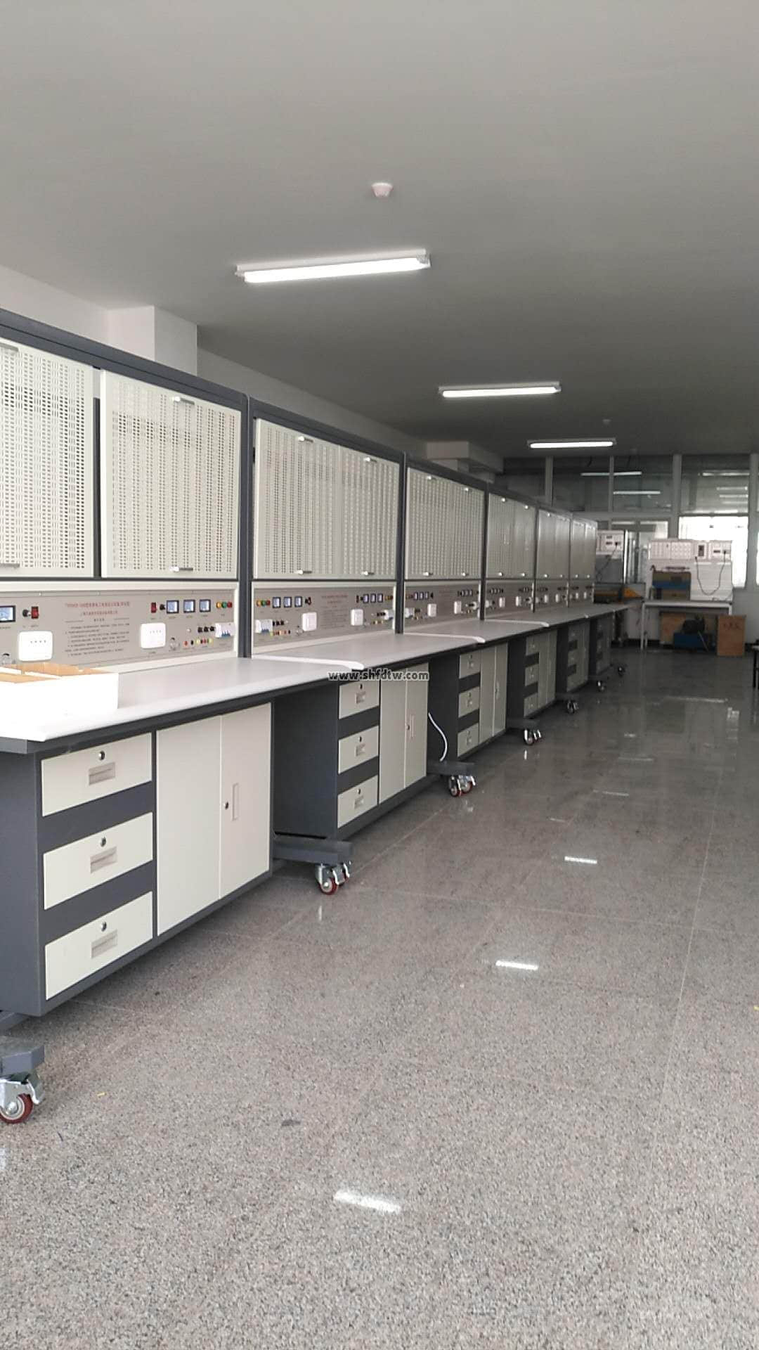 4、實訓(xùn)桌桌面采用25mm麻灰色高密度層壓板封邊特制,有效提高絕緣等級;實驗桌底部裝有至少4個導(dǎo)向輪,方便實訓(xùn)臺架移動;