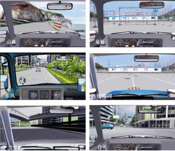座艙包含了與真實(shí)車(chē)輛相同的操作部件,“五大”操縱機(jī)構(gòu):方向盤(pán)、離合器,腳剎,油門(mén)和手剎。真車(chē)變速器:倒檔、一檔、二檔、三檔、四檔、五檔和空擋(自動(dòng)檔只含前進(jìn)檔、倒車(chē)檔和駐車(chē)檔)。真車(chē)操作開(kāi)關(guān):左轉(zhuǎn)向燈、右轉(zhuǎn)向燈、應(yīng)急燈、喇叭、點(diǎn)火開(kāi)關(guān)、總電開(kāi)關(guān)、安全帶、車(chē)門(mén)、雨刷、遠(yuǎn)光燈、近光燈、遠(yuǎn)近光交替。
