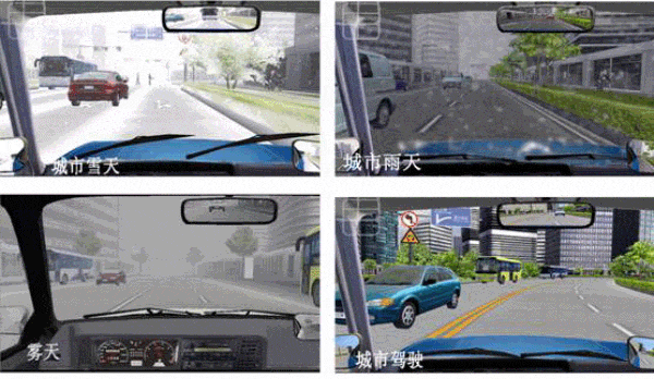 目前的駕駛模擬軟件只支持單一的訓(xùn)練天氣,如“晴天”,“雨天”等等。本系統(tǒng)除了設(shè)置單一訓(xùn)練天氣“晴天”,“雪天”,“雨天”,“黑夜”,“霧天”外,還設(shè)置了“全天候”天氣訓(xùn)練,在一個(gè)訓(xùn)練場(chǎng)景中變換訓(xùn)練天氣,例如開(kāi)始訓(xùn)練時(shí)候可能是晴天,訓(xùn)練一段時(shí)間后變?yōu)椤坝晏臁?,過(guò)一段時(shí)間后又變?yōu)楹谝?,?xùn)練學(xué)員對(duì)于各種不同天氣的適應(yīng)能力。