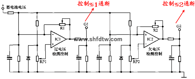 是蓄電池過欠電壓的檢測控制電路,主要是對蓄電池的電壓隨時(shí)進(jìn)行取樣檢測,并根據(jù)檢測結(jié)果向過充電、過放電開關(guān)器件發(fā)出 接通或關(guān)斷的控制信號。