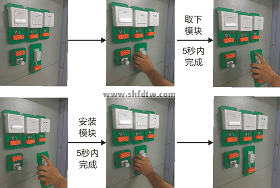 (1)各實(shí)驗(yàn)器材器具、插座、開(kāi)關(guān)等,采用模塊化形式,以便于組織和實(shí)施考試工作,考試模塊與實(shí)驗(yàn)屏之間采取快速連接方式:任何一個(gè)考試模塊,均可在20秒之內(nèi)實(shí)現(xiàn)取、放、固定到底板上或更換,并可根據(jù)考試電路的要求,平滑移動(dòng)到實(shí)驗(yàn)屏上任意位置。