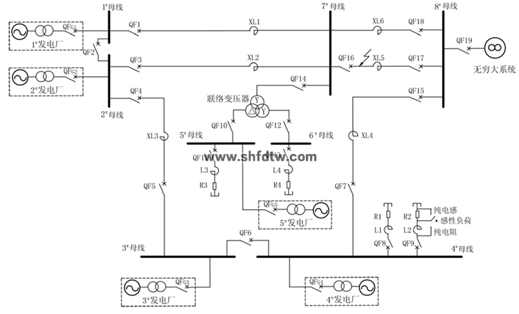 5)此電力網(wǎng)是具有多個接點的環(huán)形電力網(wǎng),通過投切線路,能靈活的改變接線方式,如切除XL3線路,電力網(wǎng)則變成了一個輔射形網(wǎng)絡(luò),如切除XL6線路,則3#站要經(jīng)過長距離線路向系統(tǒng)輸送功率,如XL3、XL6線路都斷開,則電力網(wǎng)變成了T型網(wǎng)絡(luò)等等。