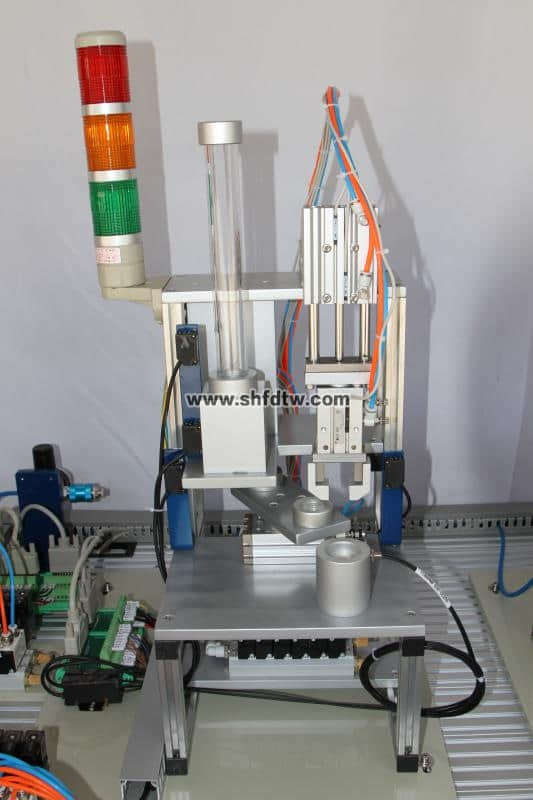 單出桿氣缸3只,金屬傳感器1只,光傳感器2只,磁性開關(guān)3只,物件導(dǎo)槽3個,單控電磁換向閥3只 |