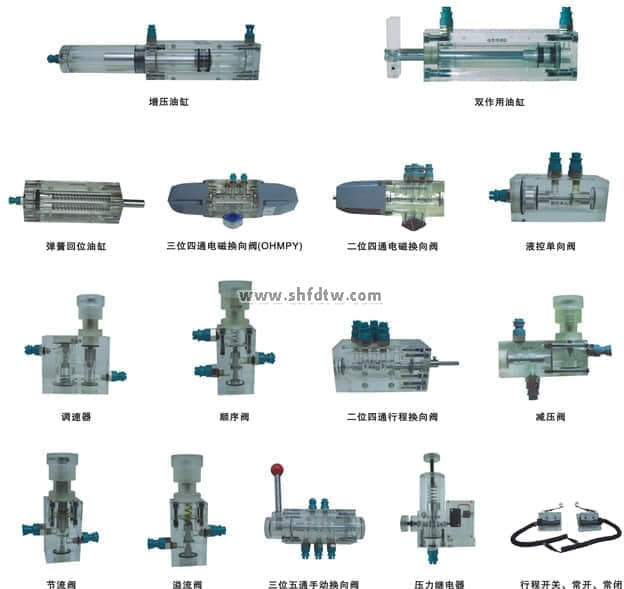 2、透明液壓試驗(yàn)臺(tái)主要由實(shí)驗(yàn)桌、實(shí)驗(yàn)支架、液壓元件和電器控制器件、可編程控制器(PLC)等組件組成。