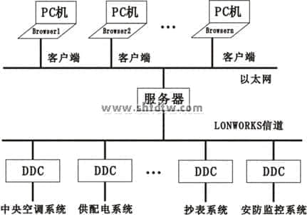 網(wǎng)絡(luò)化是智能樓控系統(tǒng)的一個(gè)重要發(fā)展方向,而基于LonWorks總線的樓控網(wǎng)絡(luò)系統(tǒng)是目前智能建筑發(fā)展的一種主流,2006年LonTalk協(xié)議成為中國國家標(biāo)準(zhǔn)化指導(dǎo)性技術(shù)文件GB/Z 20177.1-2006?!疤焱虒W(xué)”為更好地滿足智能樓宇教學(xué)的需要,與美國埃施朗和國內(nèi)相關(guān)廠家進(jìn)行合作,推出了一系列基于LON總線的智能樓宇教學(xué)實(shí)驗(yàn)裝置?!癟WLY-42現(xiàn)場總線樓宇綜合控制系統(tǒng)”是此類系列產(chǎn)品之一。它具備IBMS系統(tǒng)兩級(jí)網(wǎng)絡(luò)和三層管理(控制)的典型結(jié)構(gòu),即采用現(xiàn)場總線網(wǎng)(Lonwalks信道)和由B/S結(jié)構(gòu)構(gòu)成的局域網(wǎng)兩級(jí)網(wǎng)絡(luò)結(jié)構(gòu),現(xiàn)場(DDC)控制、過程管理(服務(wù)器)、遠(yuǎn)程客戶管理三層管理結(jié)構(gòu)。其結(jié)構(gòu)如下圖所示: